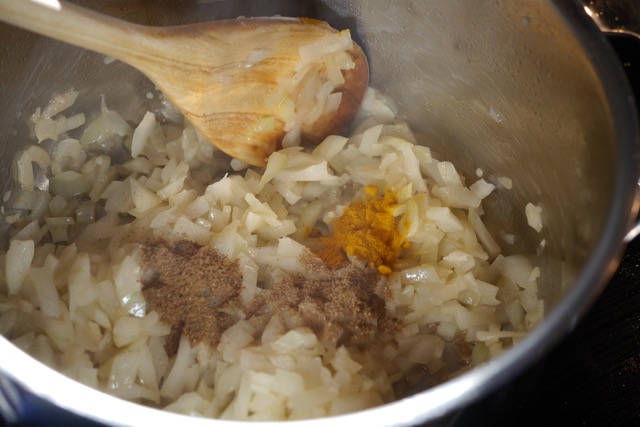 2) In a medium pot, heat up 1 tbs butter, and sauté garlic and onion.