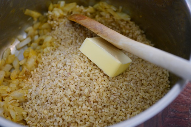 4) Add bulgur and 1 tbs butter and mix until bulgur is coated with butter.