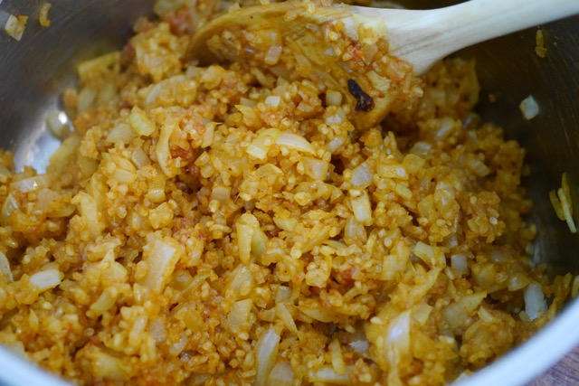 6) Dissolve bullion cube in a boiling water, and add into bulgur mixture.