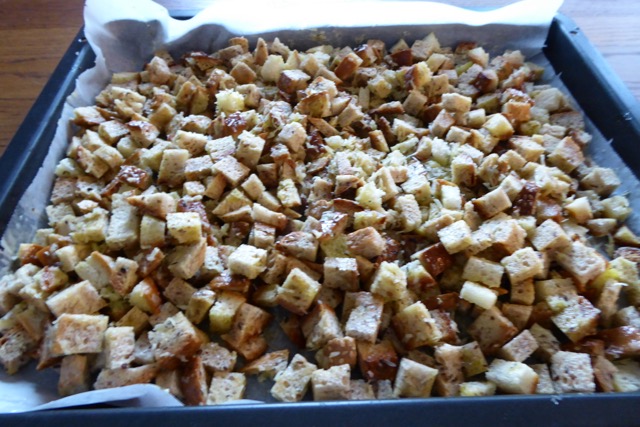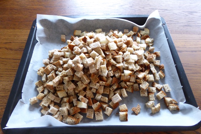 Tips: turn and mix the bread cubes occasionally so that they will be baked evenly.