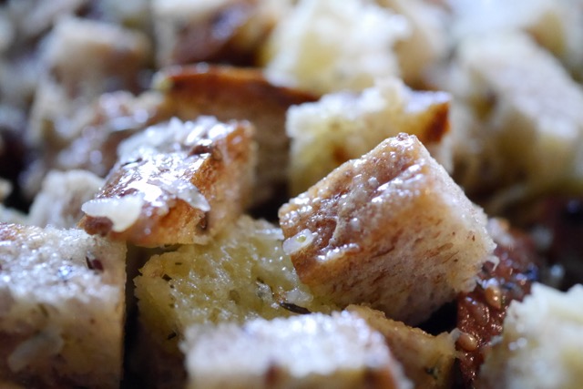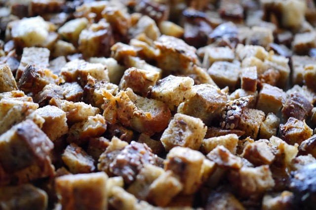 4) Sprinkle the melted butter, olive oil, herbs, parmesan cheese, (and black pepper) over cubes of bread and mix until each cubes are coated.