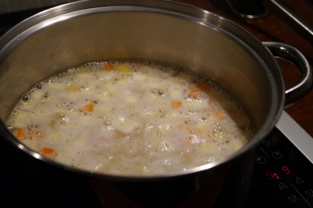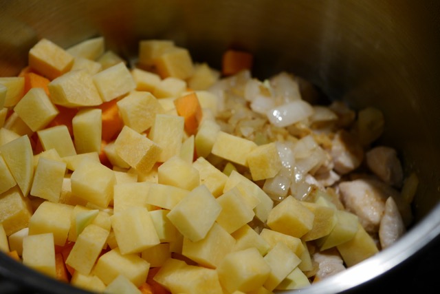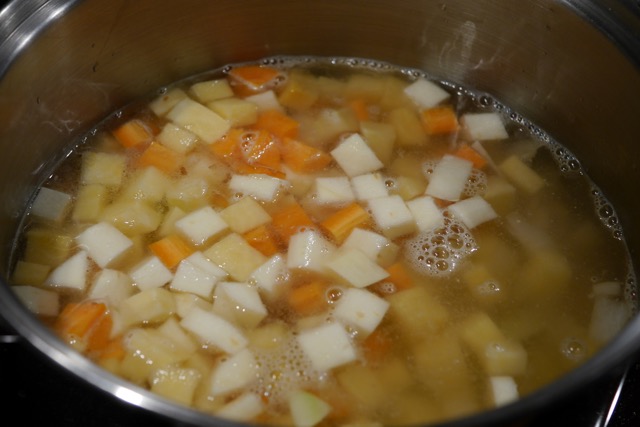 4) Add carrots, parsnip, and swede into the pot, and fill with water.