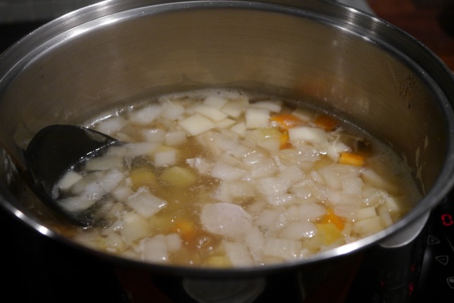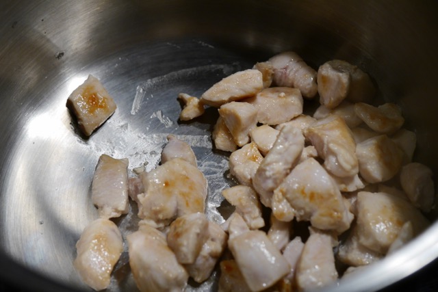 2) Fry chicken cubes, and set aside in a large pot for soup