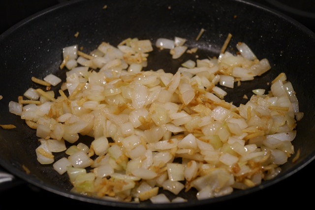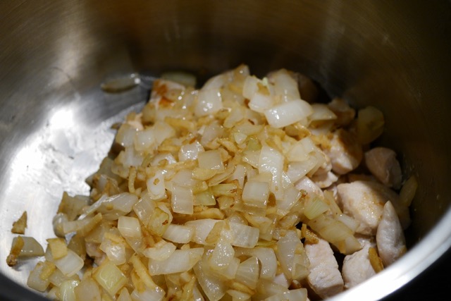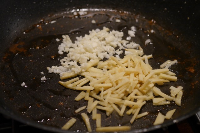 3) Fry garlic and ginger. When you can smell aroma, add onion, lower the heat, and continue frying until onion become transparent. Set aside into the same pan as chicken.