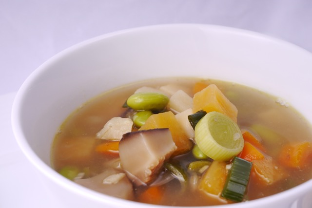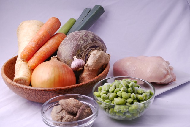 My mother used to make this soup. It really makes you warm, and great soup when you are having cold! My mother used to add root vegetable (whatever she had) but the few of them are fundamental: chicken, ginger, dried Shiitake mushroom, and Edamame (fresh soy beans without pods).