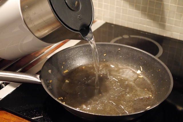 Tips: Use the same frying pan to add the water. All the good flavor is on the frying pan. Just pour hot water into the frying pan and pour them into the pot.