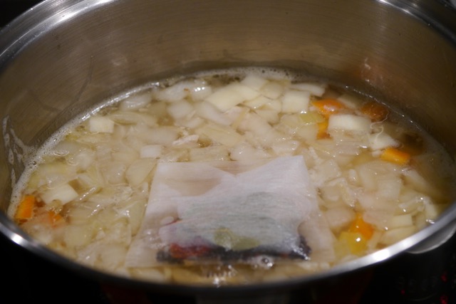 7) Lower the heat, add spices except bullion (in sachet if possible.)