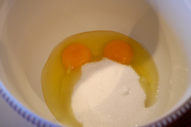 3) Whip eggs and sugar with electric mixer until thick, pale, and fluffy. Then add vanilla extract.