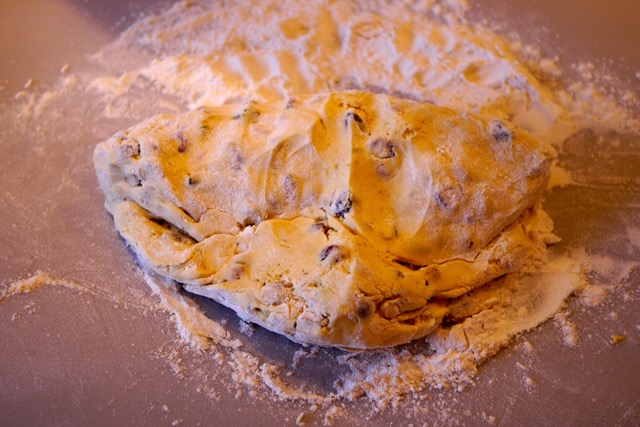 12) Using a sharp knife (serrated knife makes it easier,) cut the log into slices (ca. 1 cm thick) on diagonal.
