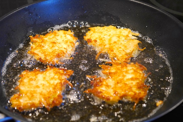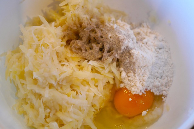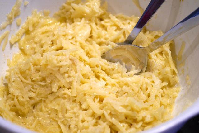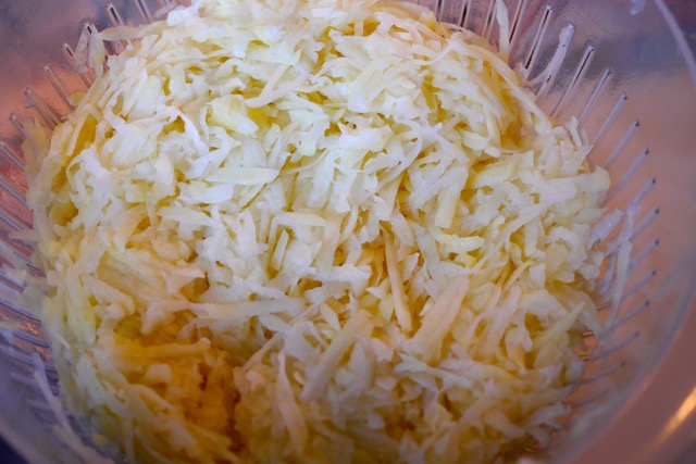 1) Peel and roughly grate potato. Wash them well until the water is clear. Drain well, and place them into a large mixing bowl.
