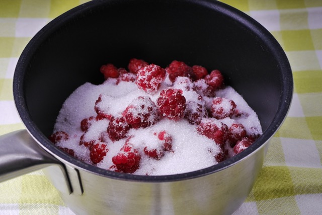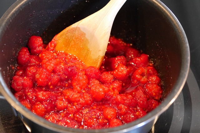 2) In a small saucepan, add raspberries and sugar. Heat until berries starts breaking down.